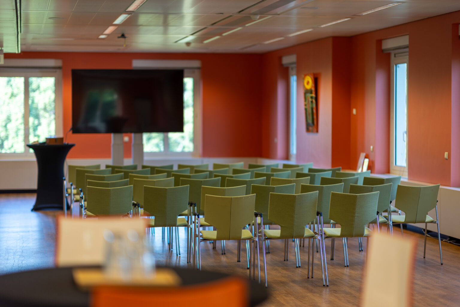 Onze zalen zijn in te richten in theater-, cabaret- of carré-opstelling. Zo sluit de ruimte altijd aan op het doel van uw bijeenkomst. Daarnaast beschikken we over moderne audiovisuele middelen voor presentaties, panelgesprekken en hybride events.
